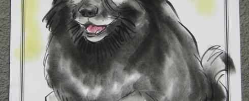 Clancy was a superb model, sitting still for the 15 minutes it took for the artist to create it. I had no idea what he was drawing, for I was sitting in front of the easel with Clancy… I just mentioned a little about the history of the keeshond breed and how Clancy enjoys “dock diving”.
