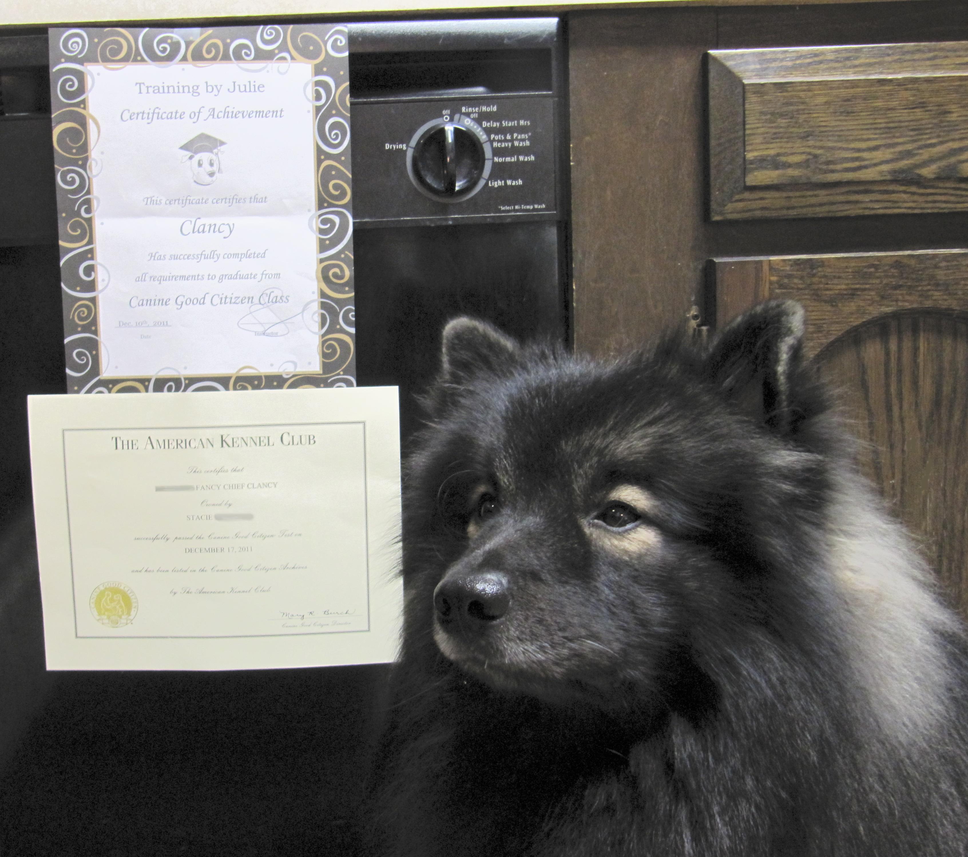 Clancy proudly sits next to his AKC Canine Good Citizen certificate and course graduation certificate. Every dog and owner should aspire to achieve this to be a confident ambassador of dog-kind! Training to pass the AKC Canine Good Citizen test (any dog, mixed or pure-bred can achieve this) takes a lot of practice and patience. If at first you don’t succeed, try… try again!