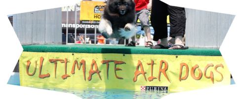 Ultimate Air Dogs dock diving competitions… On left: Clancy waiting his turn to dock dive at “The Andersons” in Ohio. On right: Clancy dock diving at Maryland Dogfest.