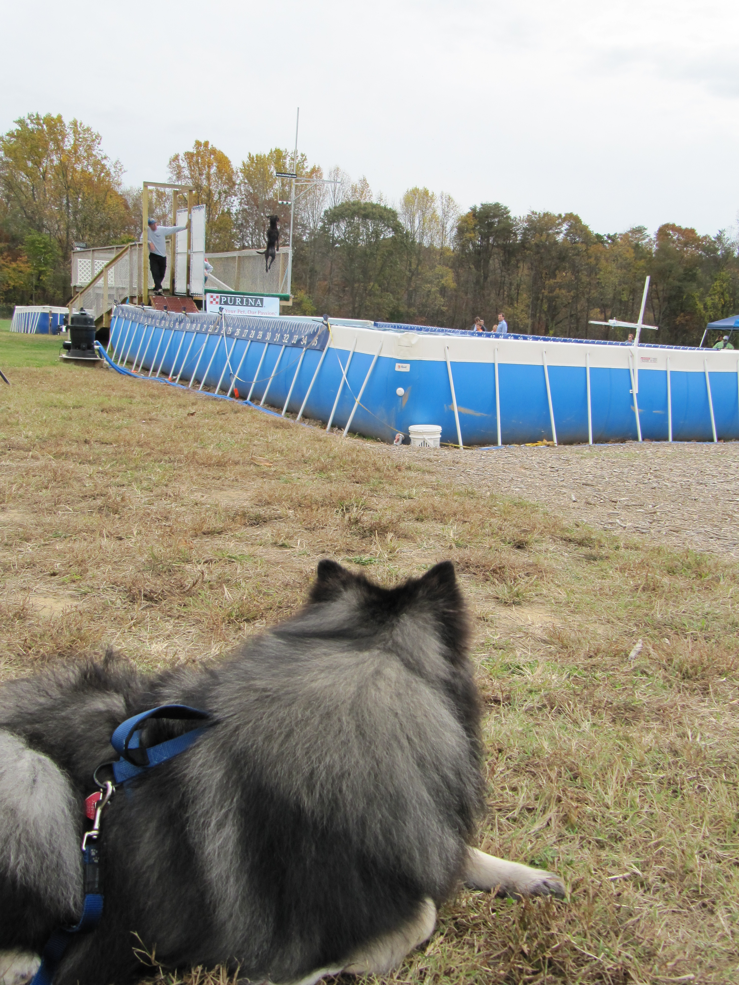 As I talked about our vacation to a local dog lover, they encouraged me to try the sport of dock diving and told me about a facility that had the regulation size dock and pool that had open practices not too far from where we lived. Just for fun, I headed there with Clancy, not even considering competition. After all, I thought a Keeshond could never be in the same league as the Labs, Retrievers and other “sporting dogs”. Well, Clancy didn’t know he was a “non-sporting” breed and leapt off the dock with just as much enthusiasm!